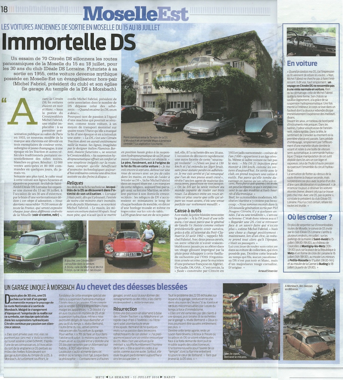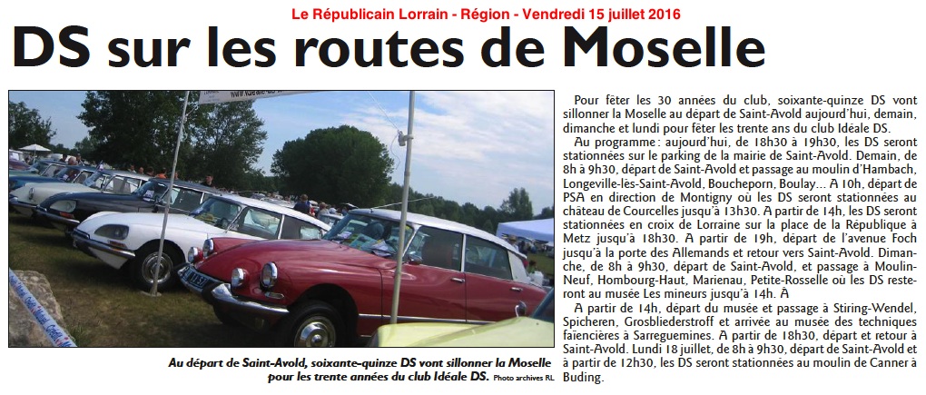Le 14 juillet, le Républicain Lorrain (Saint-Avold) nous adresse une piqure de rappel à la une, et le même article ou presque « Aérer sa DS sur les routes de Moselle » que celui paru le 9 à Montigny et le 10 à Saint-Avold. Je ne vous le ressert donc pas, vous savez où le retrouver.