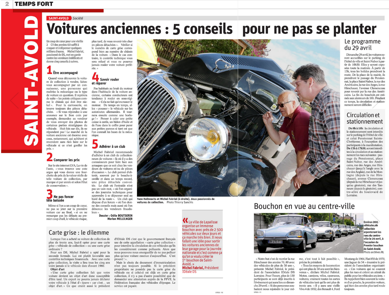 Et rebelote dans le même journal le 26 avril, mais là c’est carrément la Une du cahier de Saint-Avold, et une double page à l’intérieur. Article très complet, sur le bouchon bien sûr (l’article du 24 est publié une 2ème fois !), mais aussi les conseils avisés de notre président, le dilemme carte grise de collection ou pas, et un beau capot de traction…