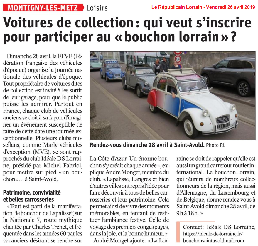 Ce jour là, IDéaleDS®Lorraine sera partie prenante de la 3ème JOURNEE NATIONALE DES VEHICULES D’EPOQUE lancée par la FFVE. Vu le succès de l’an dernier , nous renouvelons l’opération.